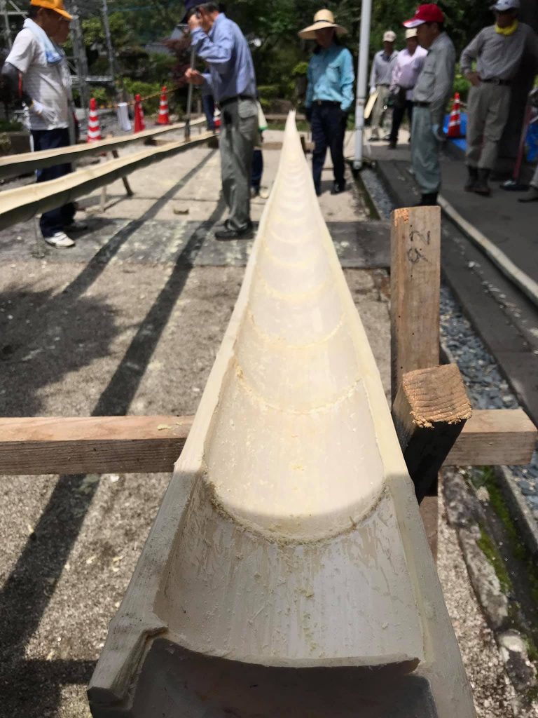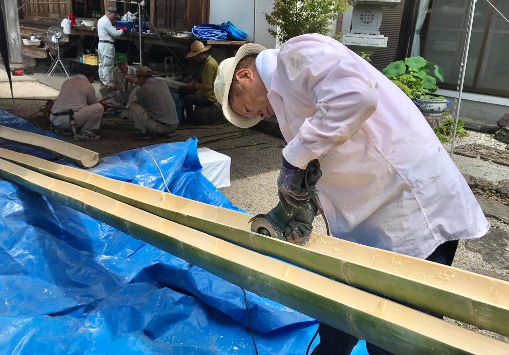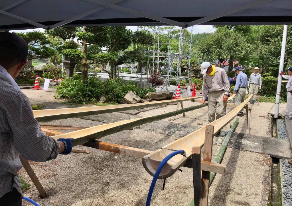 12メートル級の流しそうめん台が無事に完成し、竹水鉄砲も60本製作してくださりました。