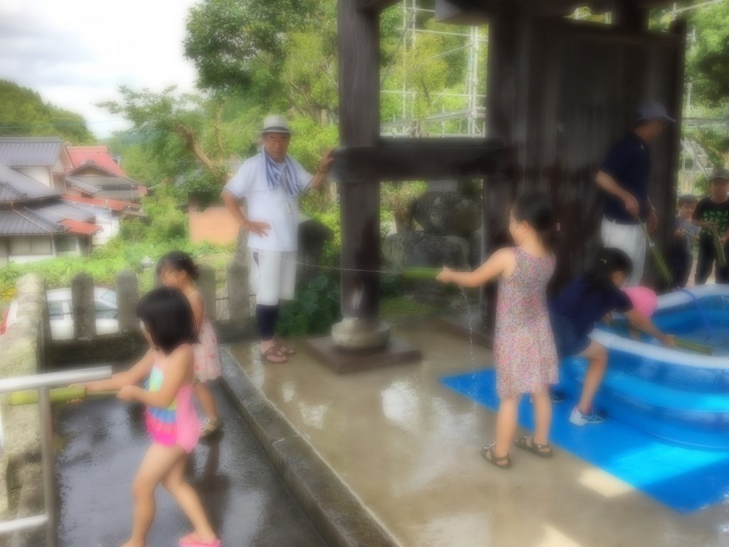 竹水鉄砲、本年は一番の出来で、子どもたちの水を掛け合う大きな歓声が響きます。