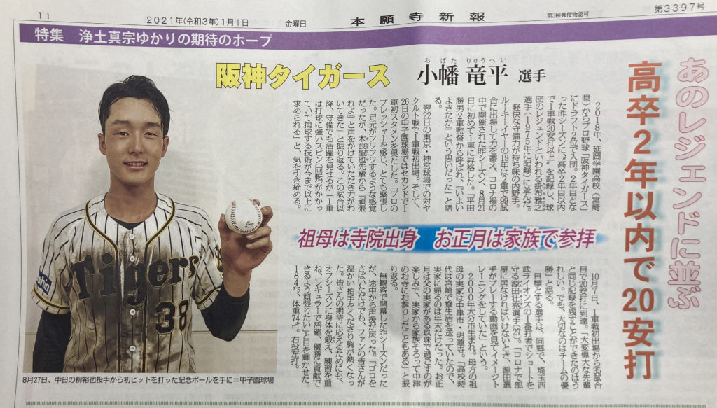 にご門徒で今年、阪神タイガースで大活躍された小幡竜平選手が紹介されています。