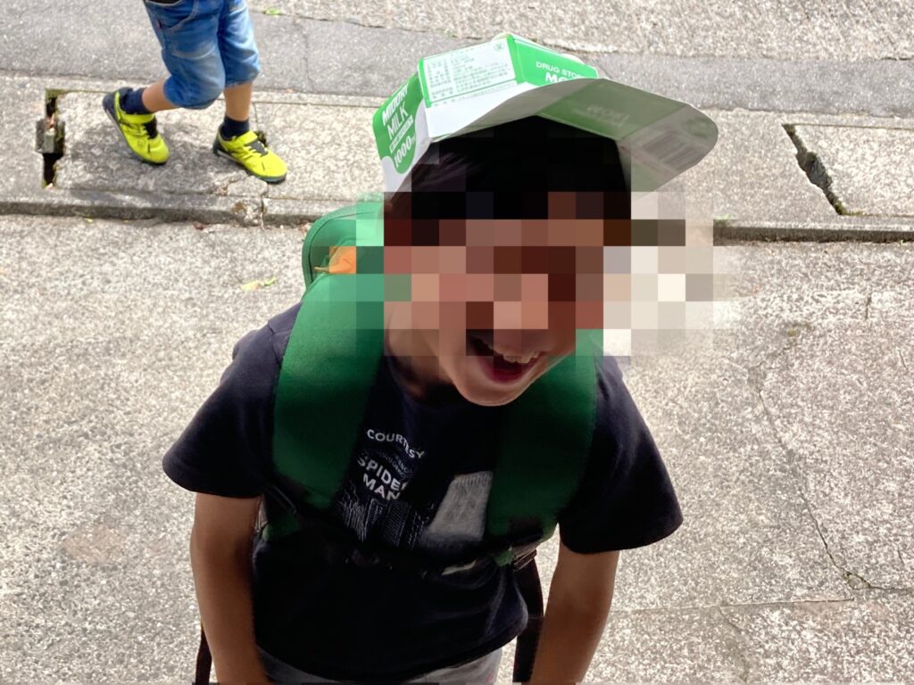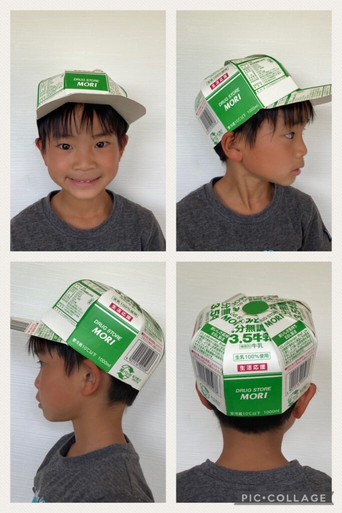 夏日が続き、未だ梅雨時期、防水効果もある牛乳パック帽子。