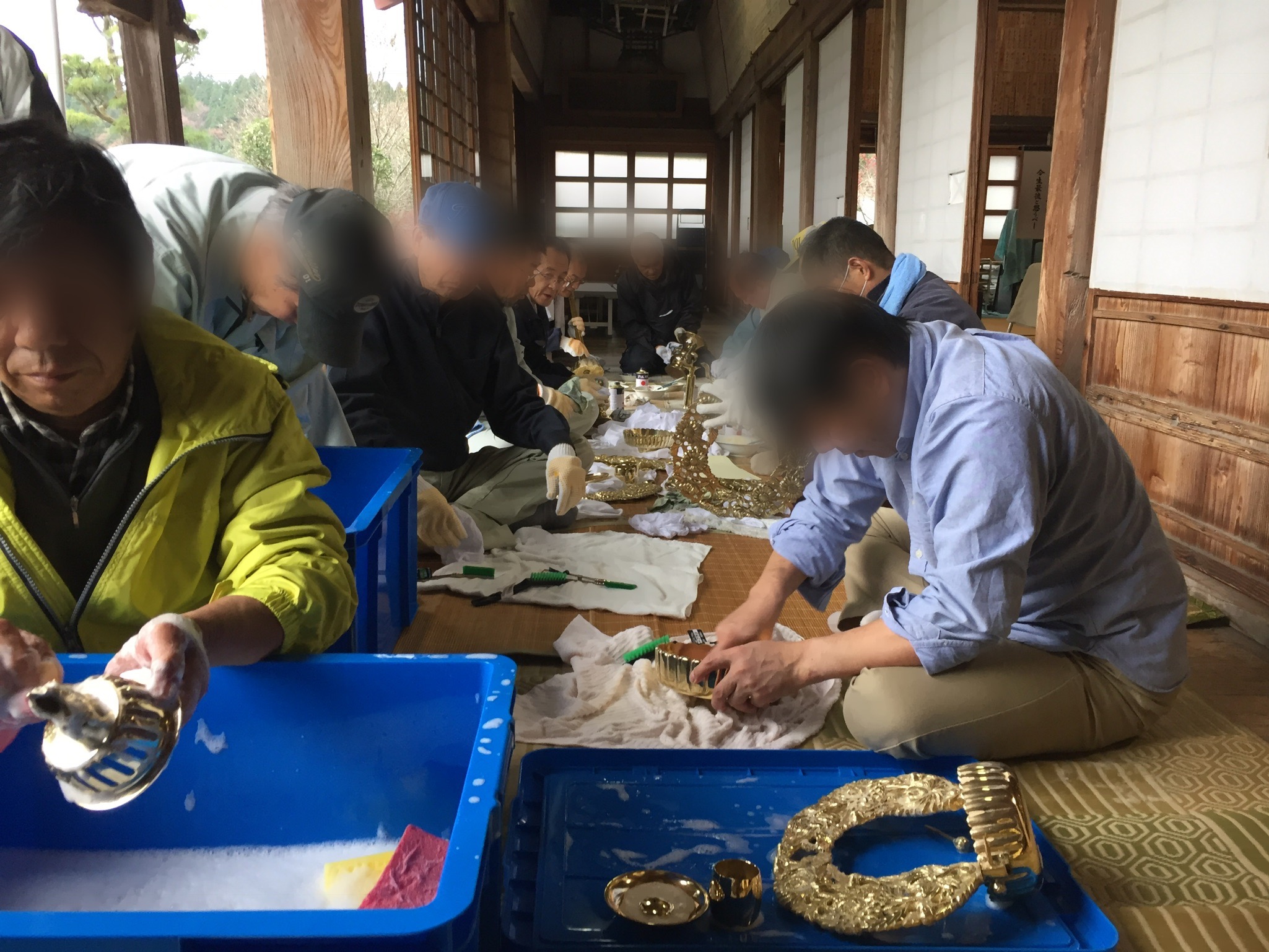 例年報恩講二日前には、お供えのお餅つき、仏具磨き、境内大掃除を行います。