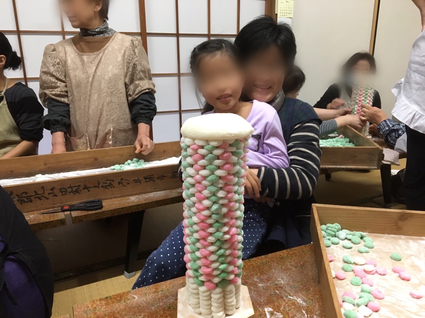 色粉のついたお餅を専用の型で抜き、組み上げて行きます。